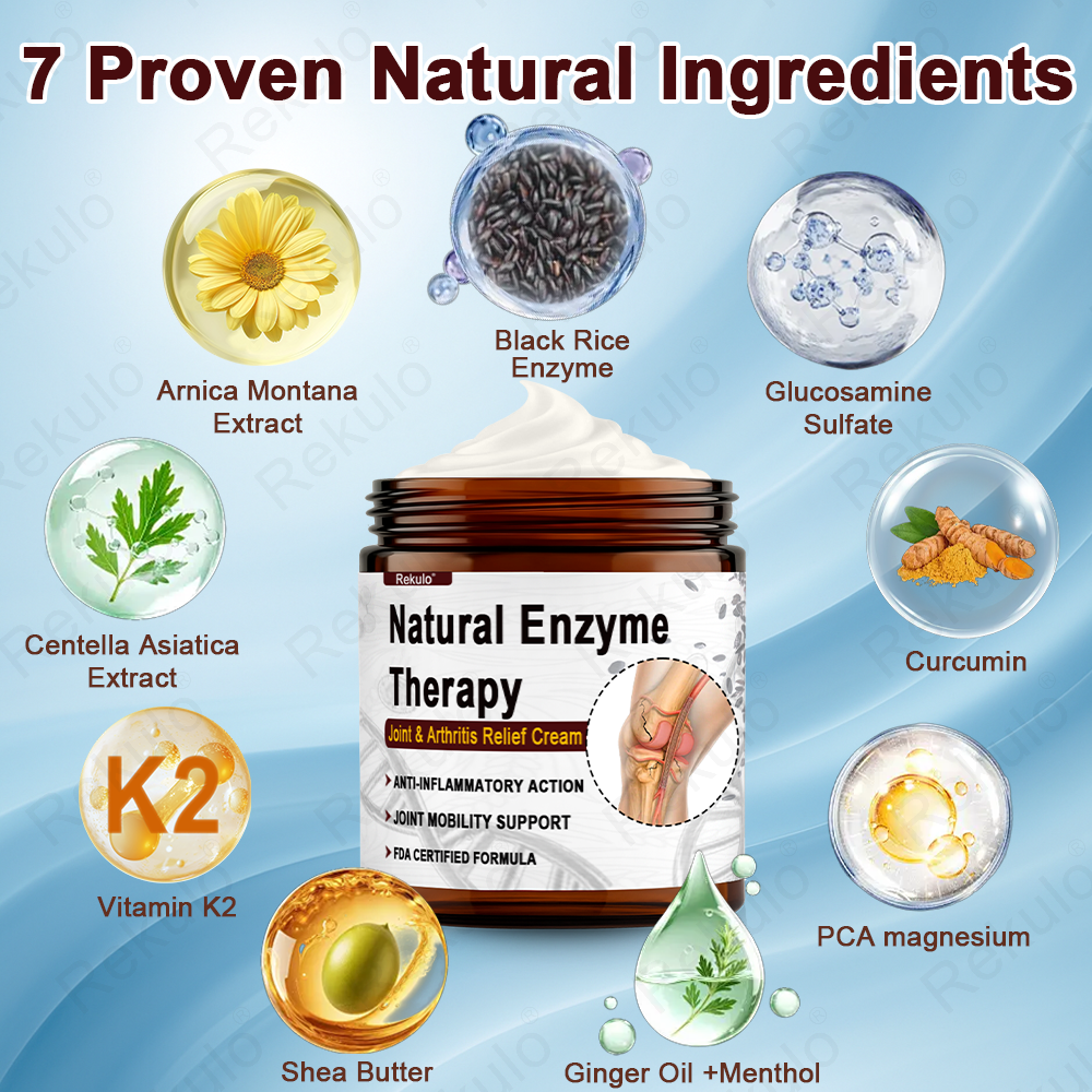 Rekulo® Black Rice Pain Healing Bone Cream combines a powerful blend of natural restorative ingredients. Its core formula of black rice enzyme and anthocyanins provides deep anti-inflammatory and antioxidant benefits, supporting tissue and joint repair. Magnesium helps relax tense muscles and nerves, while curcumin, arnica extract, and menthol work together to relieve pain, reduce swelling, and calm localized inflammation. Enriched with centella asiatica, ceramides, and shea butter, it also nourishes and strengthens the skin barrier, keeping it soft and hydrated — helping your joints regain comfort, flexibility, and natural vitality.